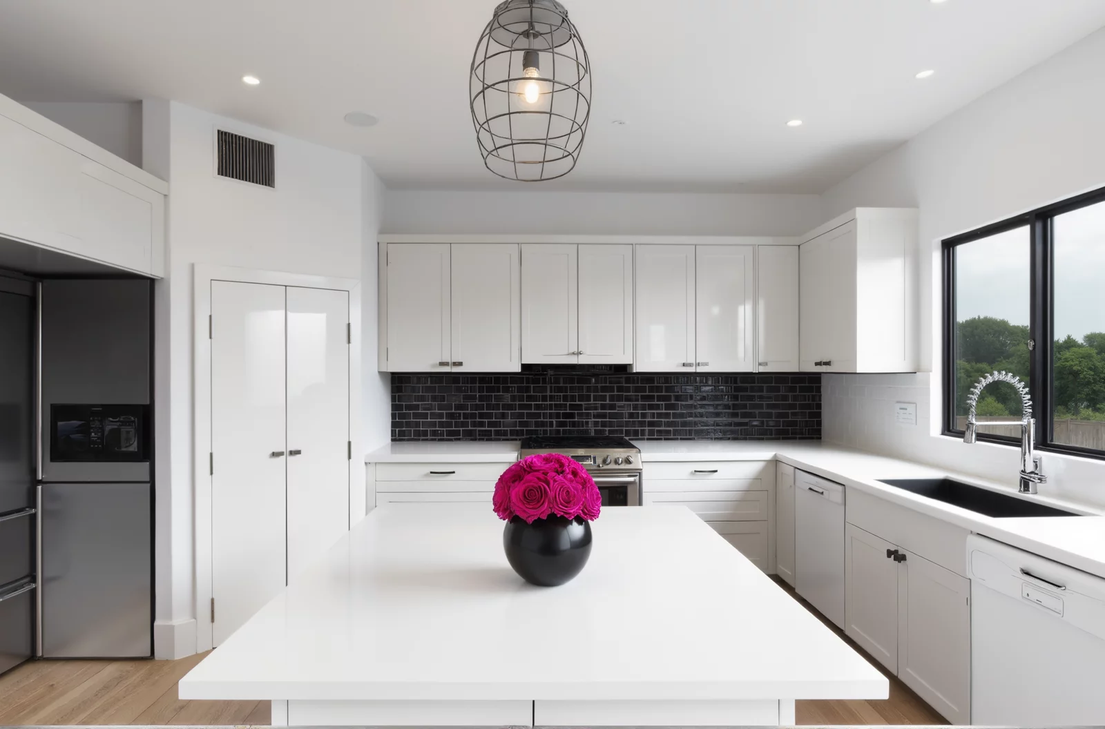 • Vibrant pink preserved roses arranged in a glossy black vase with silver plaque for elegant contrast.