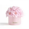 • Pale pink preserved hydrangeas in a glossy ceramic vase, soft modern charm.