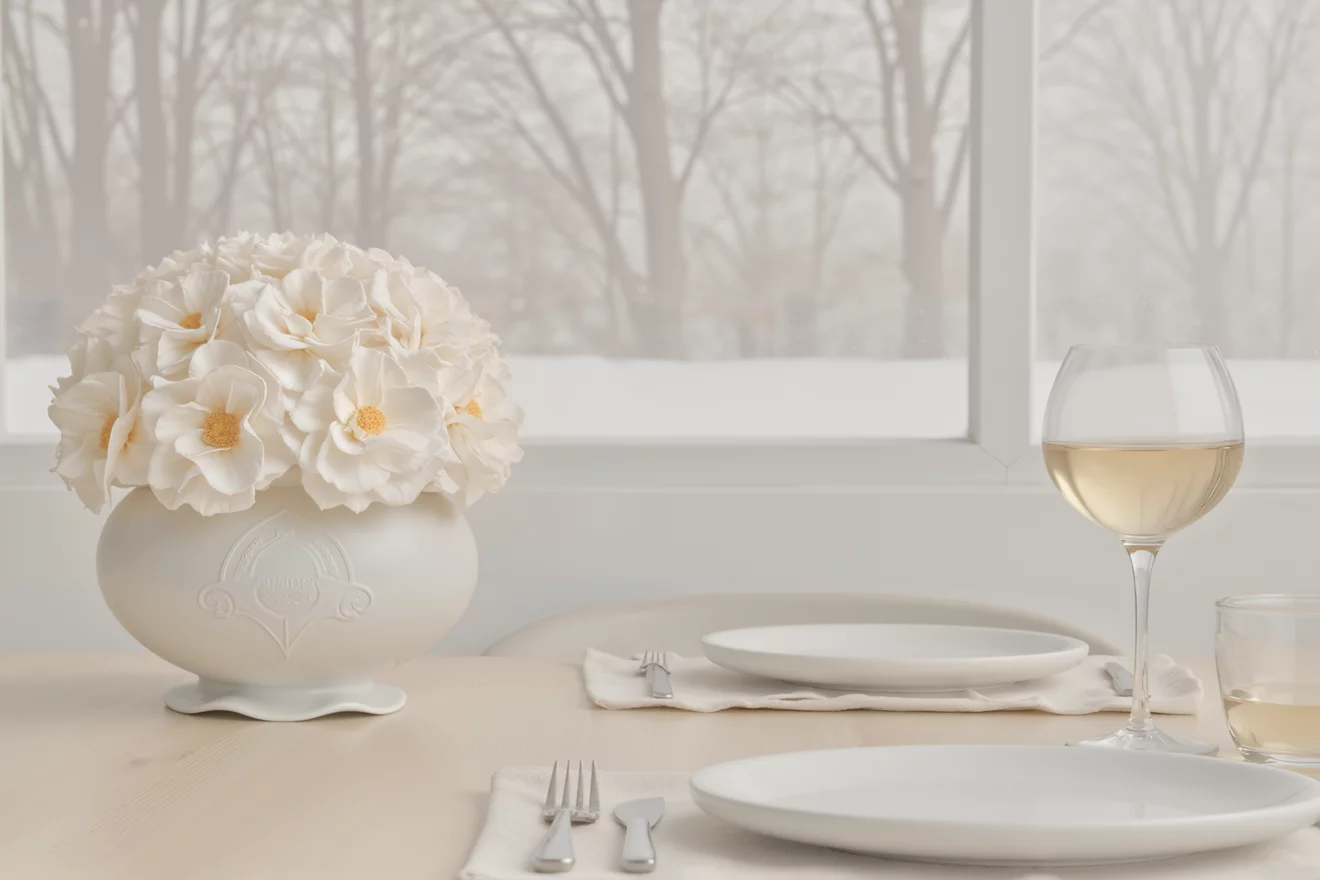 • White preserved hydrangeas in a scalloped vase, pure sophistication personified.
